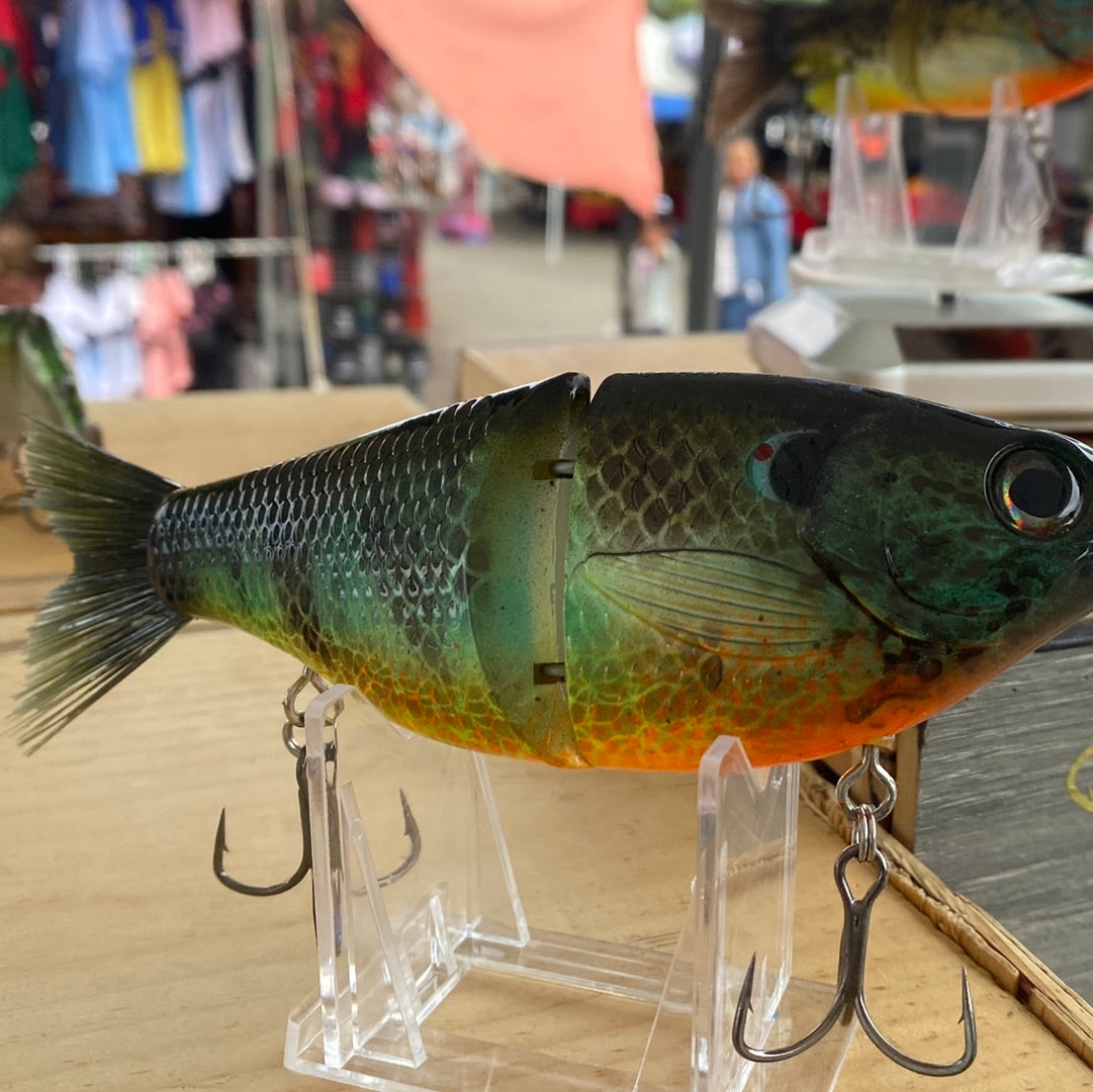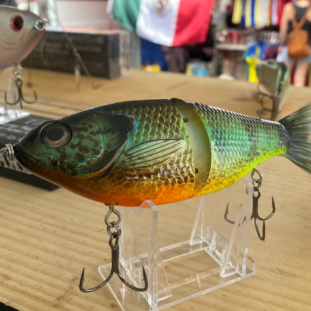 7 inch, 2.1 oz, slow sinking, 2 segments with rattling balls, swiveling front and rear hook hangers, colors shift depending on the light or angle, Mustad KVD hooks, Stainless steel split rings.