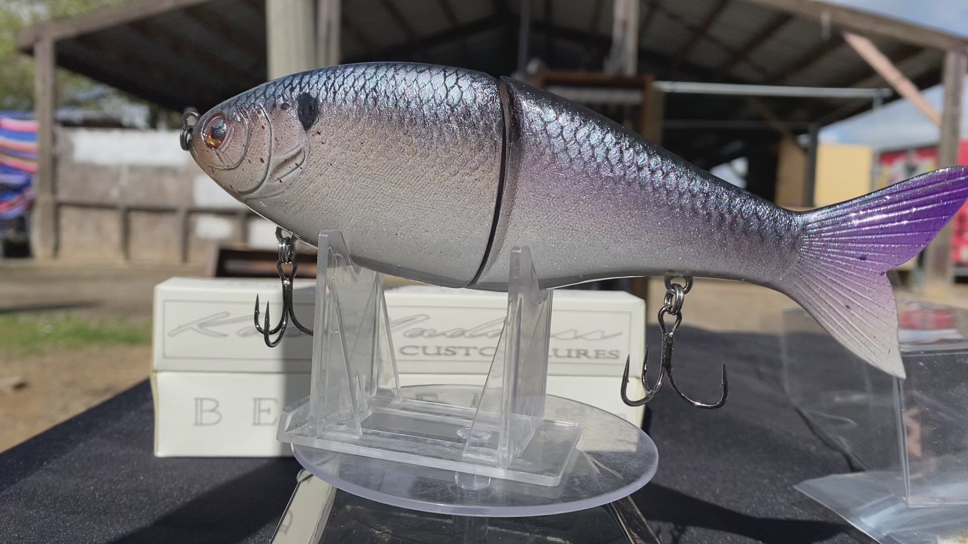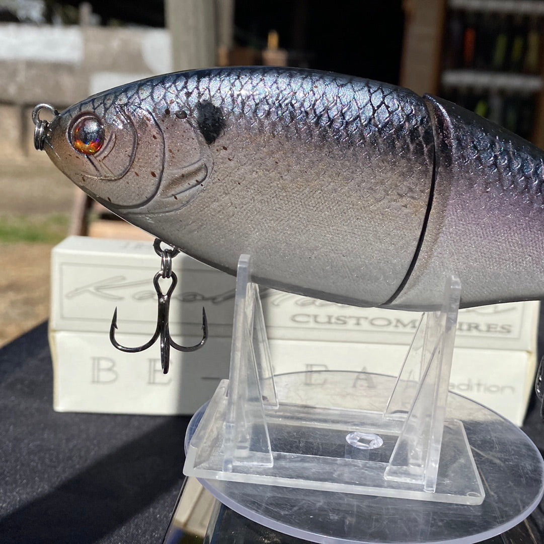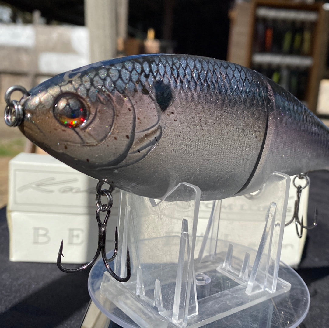 7 inch, 3oz, slow sinking glide bait. Hard tail w/ steel ball rattling. Power action lure. Mustad KVD hooks
