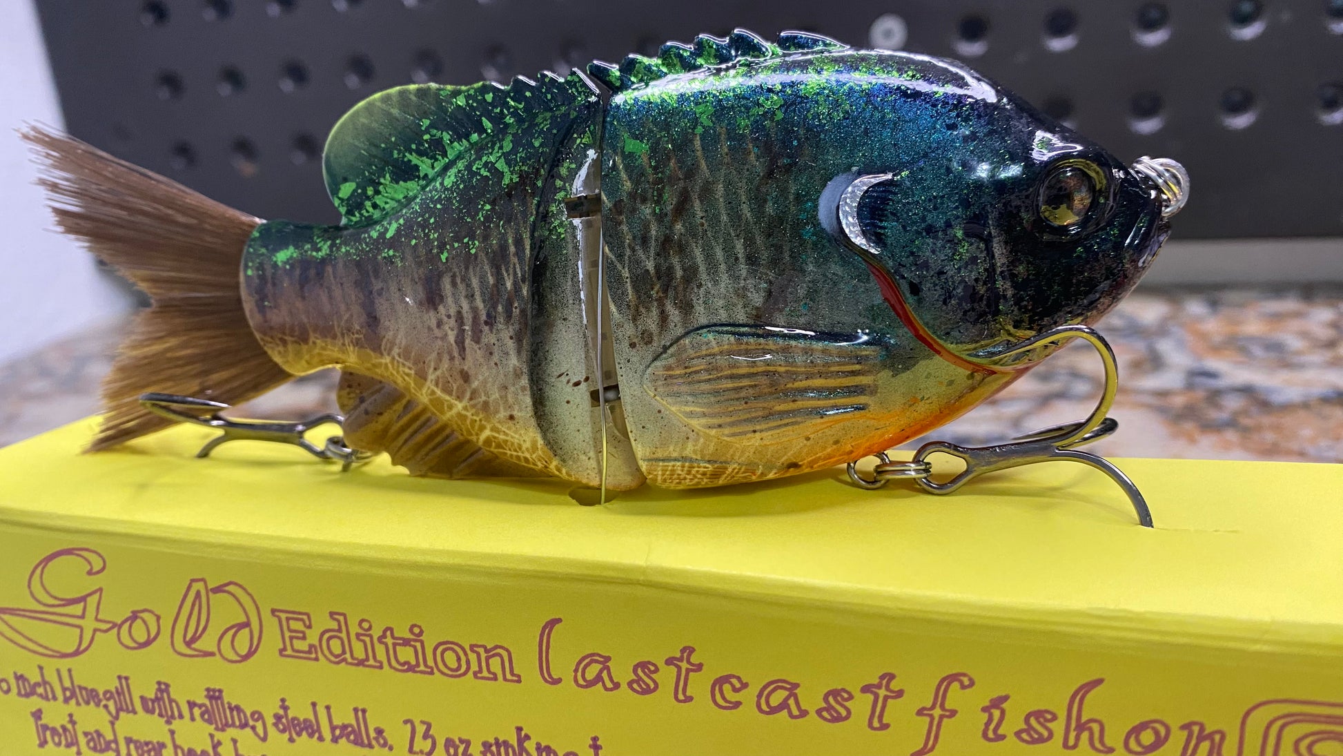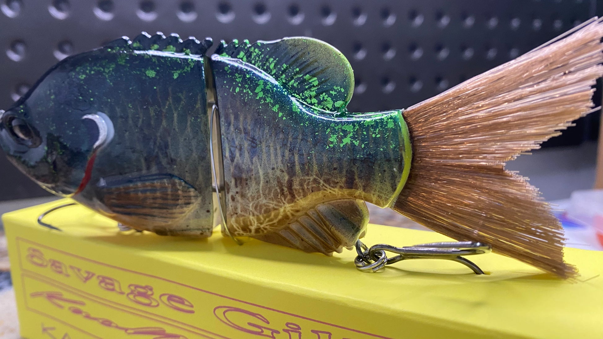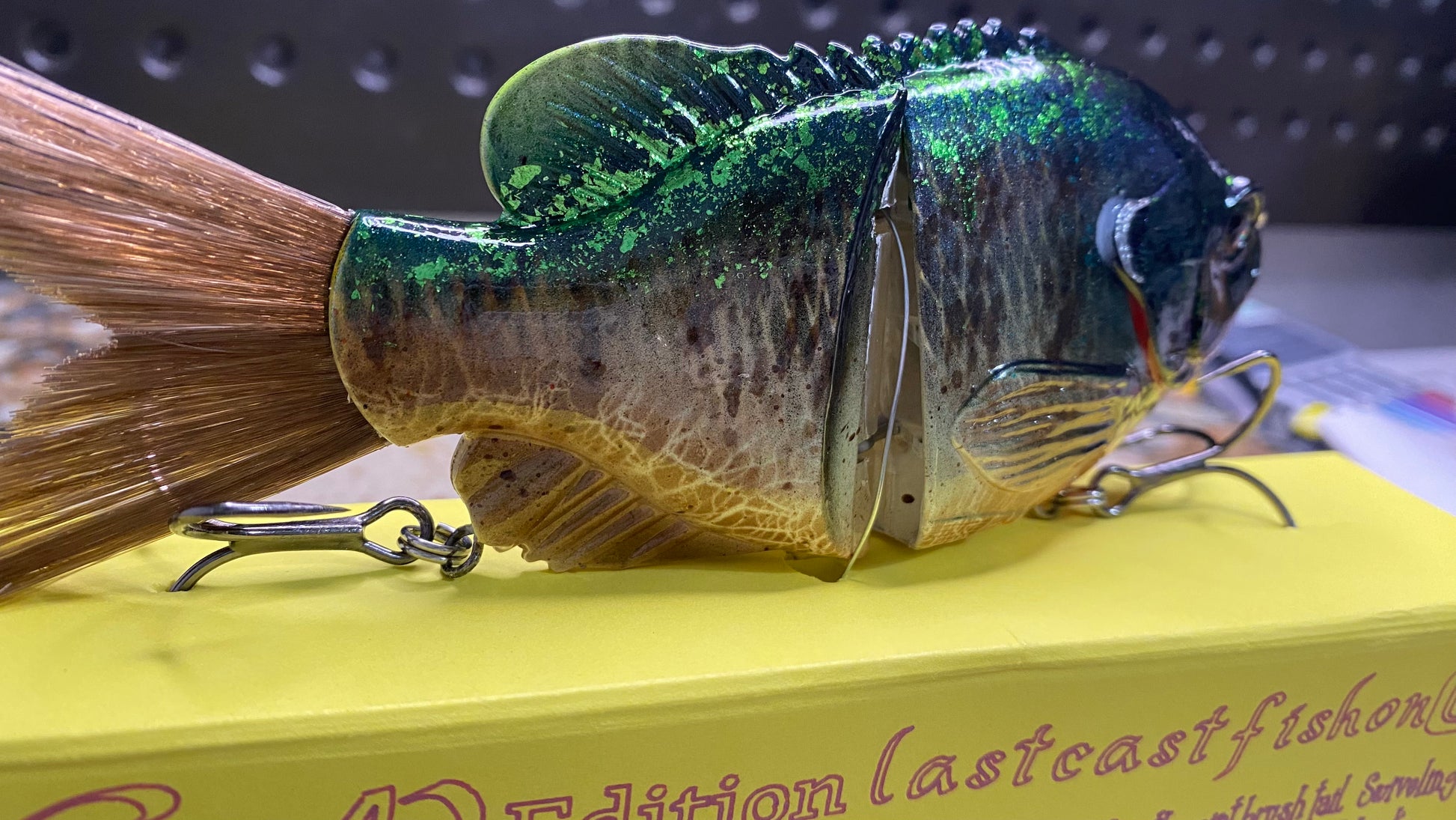 2.3 oz sinking, two segmented swim bait with paint brush tail,