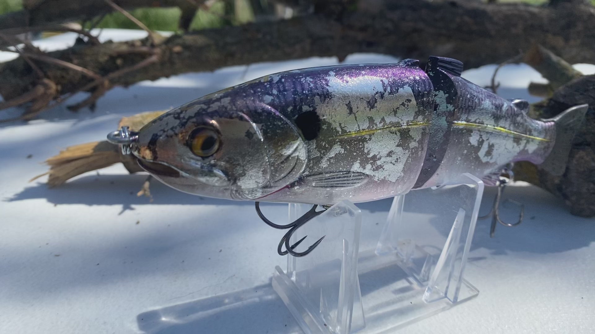 7 inch trout soft tail glide bait 2.2 oz. 2 segments with rattling balls, s- curve action, color shift depending on the light or angle. Metal flakes on top given more shine. Mustad KVD hooks, Stainless steel split rings. Soft tail