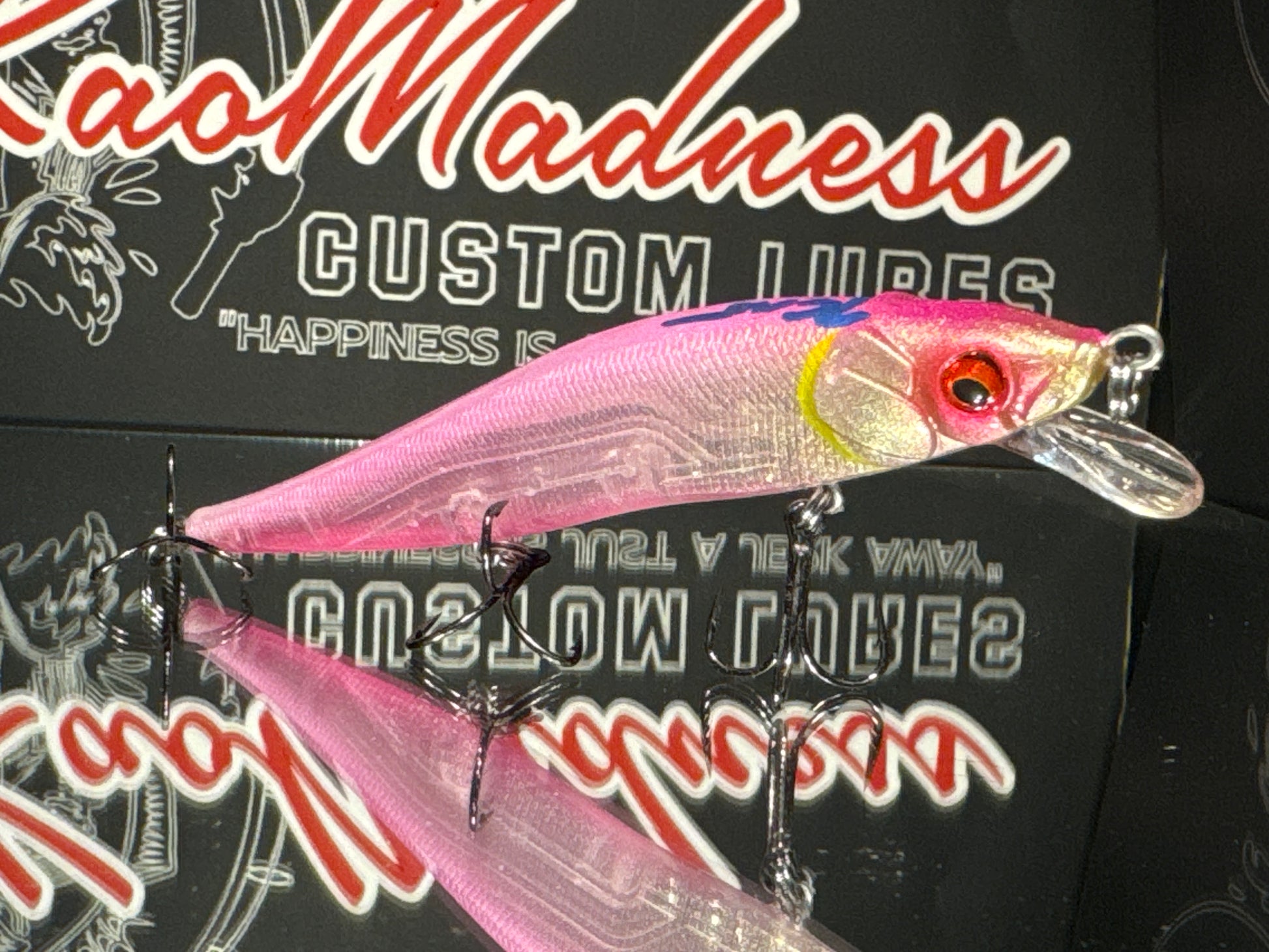 4.5” in length with a weight of 1/2 oz and diving depth 4’-6’. This lures is custom tune to slowly sink, pair with KVD Mustad hooks and high carbon feather hook. It has an amazing rattling sound, produced from steel balls. As it stated in it name “Ghostly Pink” it translucent with a red face around the eyes with a fluorescent pink and a yellowish gill line.