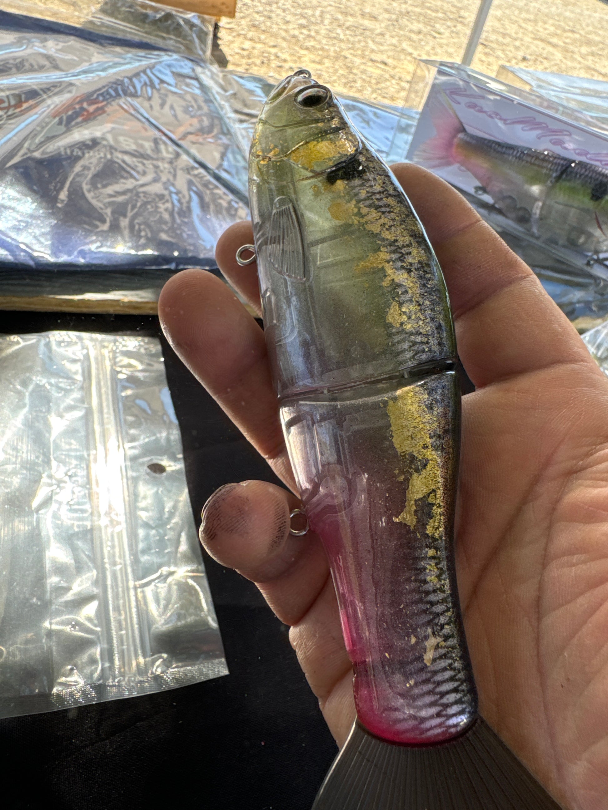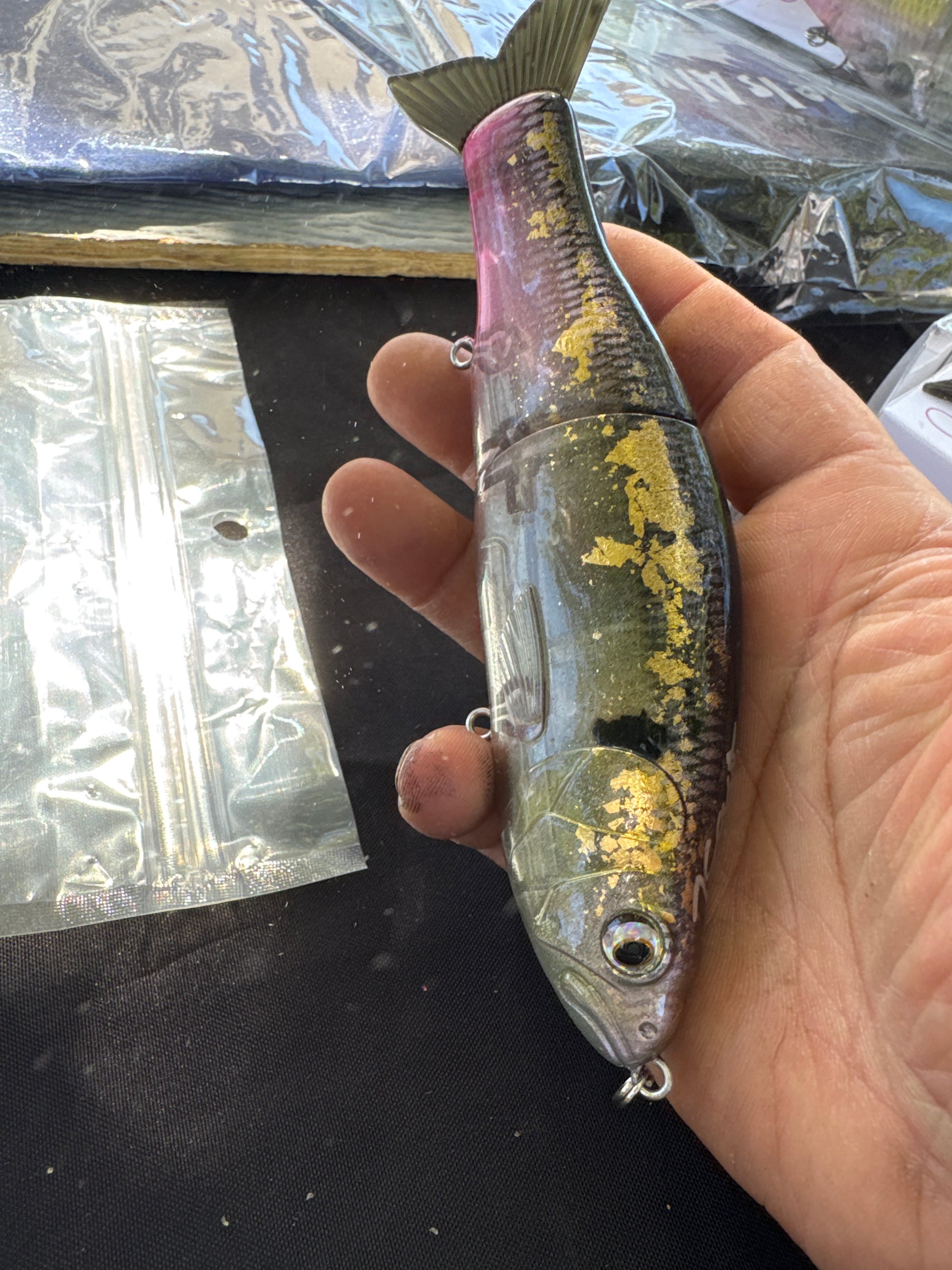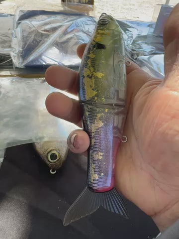 7” 2.15 oz, slow sinking/ floating, 360 degree turn maneuver. Changing retrieving speed tunes it to wide or tight swimming motions to trigger a reaction bite. Lure has built in magnets to hold hooks in place. KVD Mustad hooks