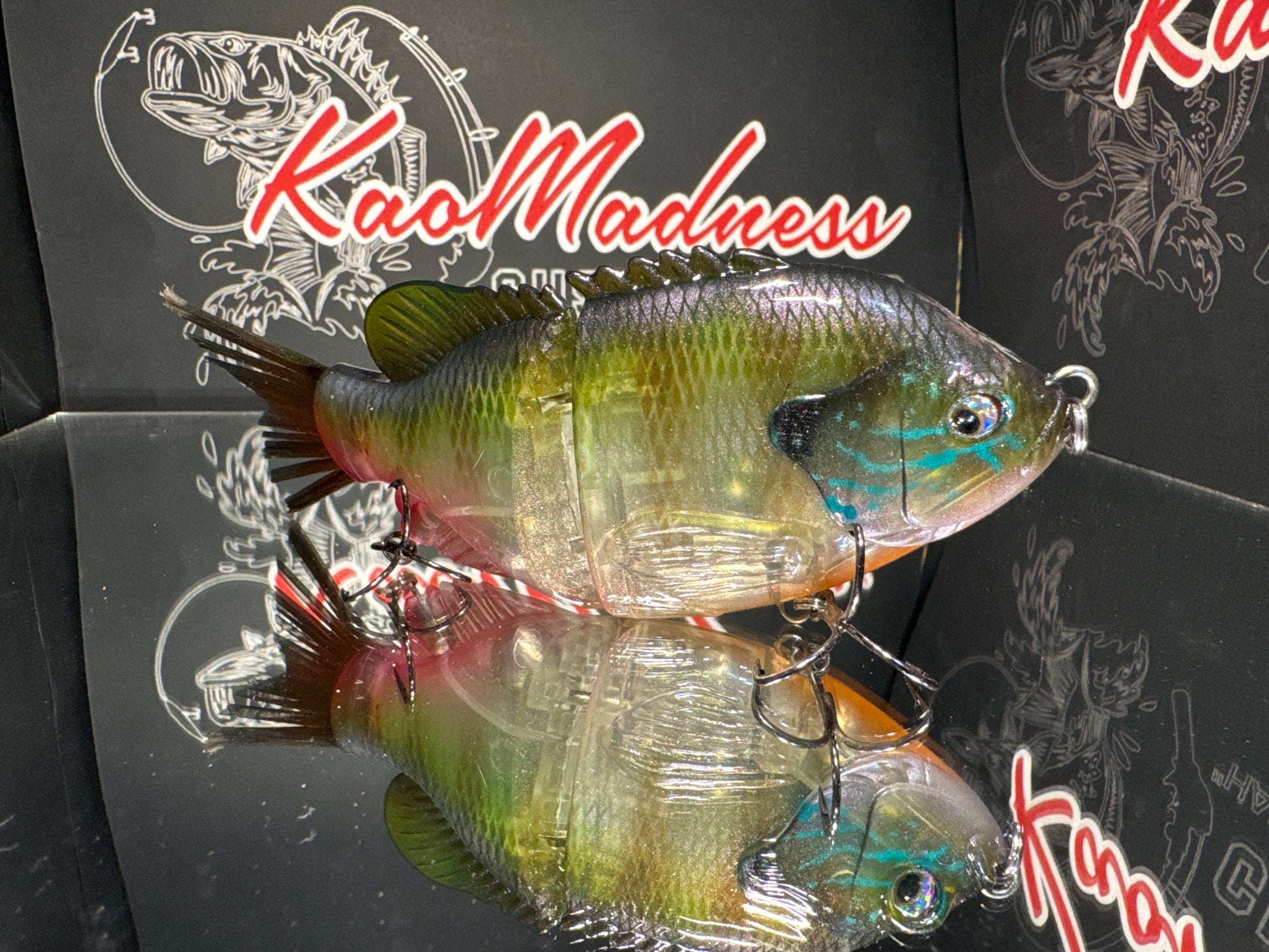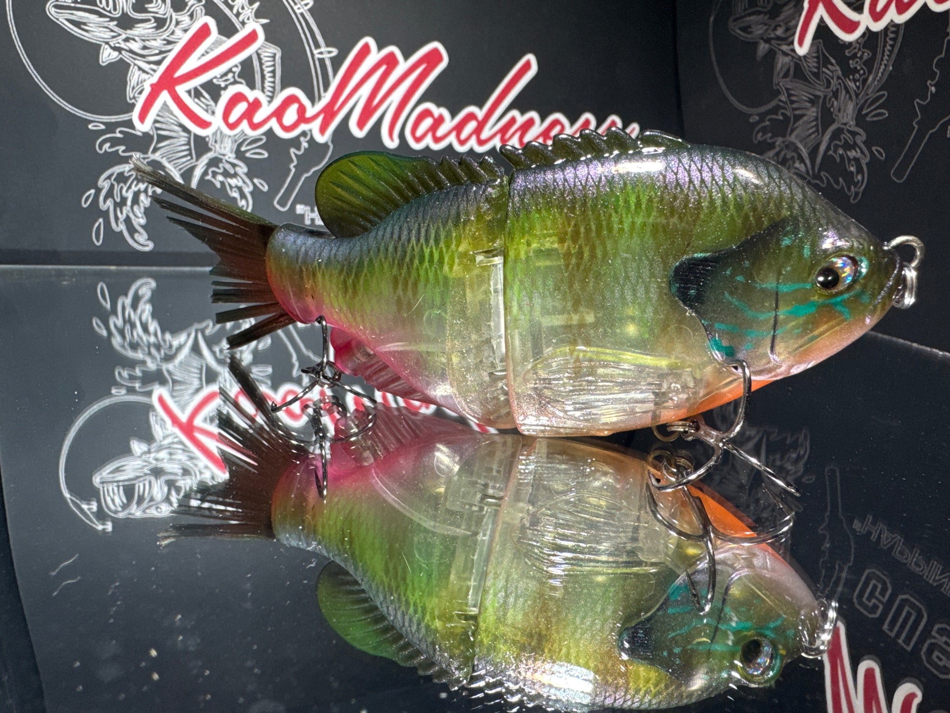 2 oz sinking, two segmented swim bait with paint brush tail, swiveling front and rear hook hangers. This lure paint scheme has a comb of fluorescent colors, color shift depending on the light or angle. It has the top fin with a light blue color much like a blue gill in water when spotted on bank or from your boat. KVD Mustad Hooks