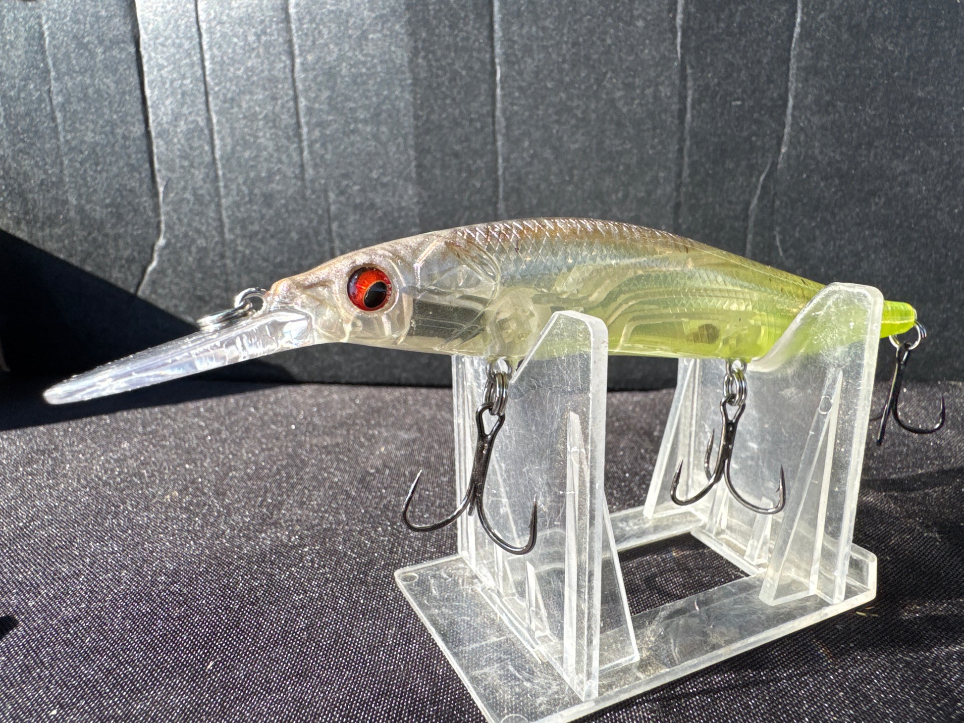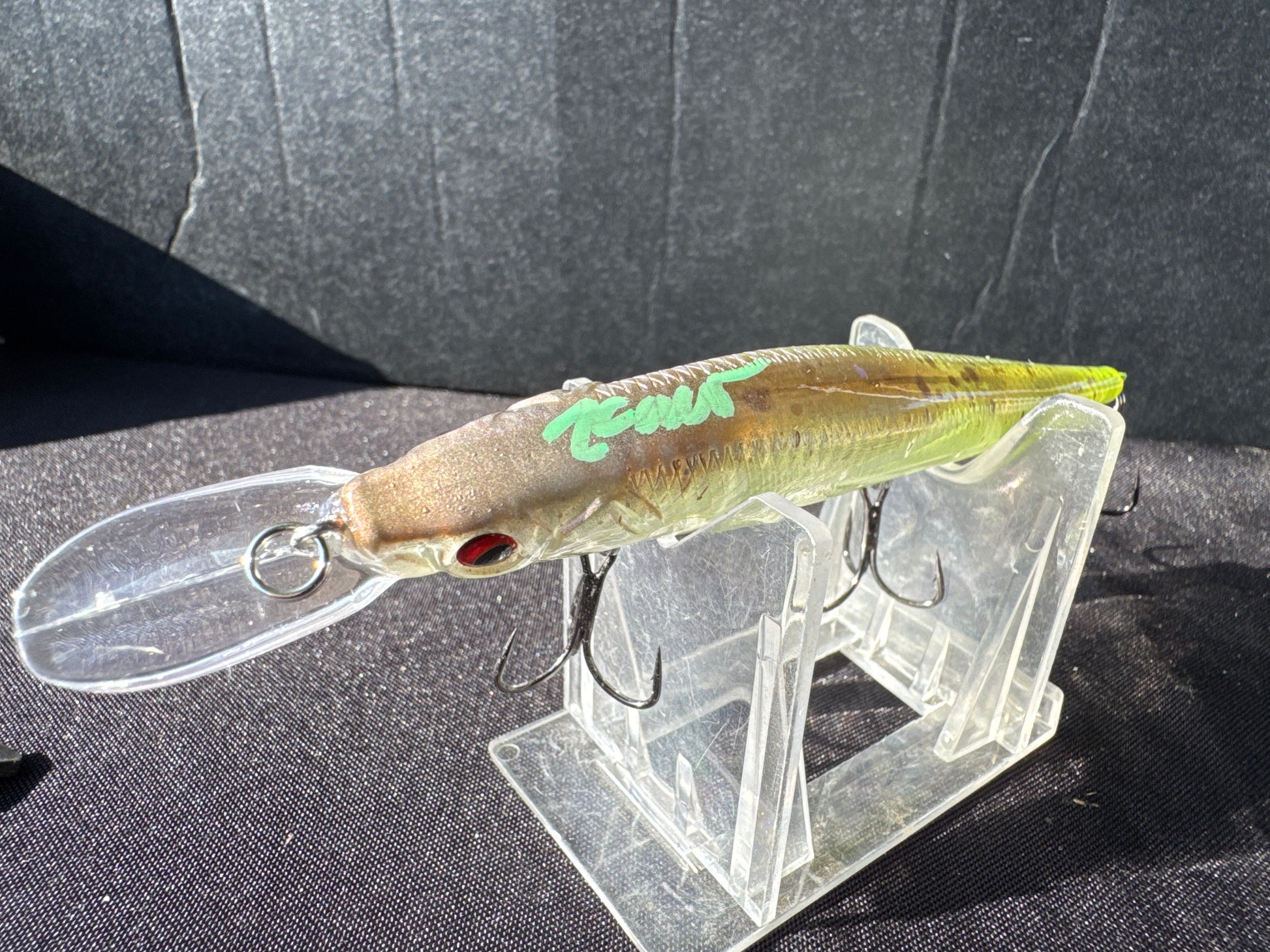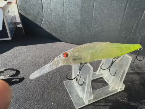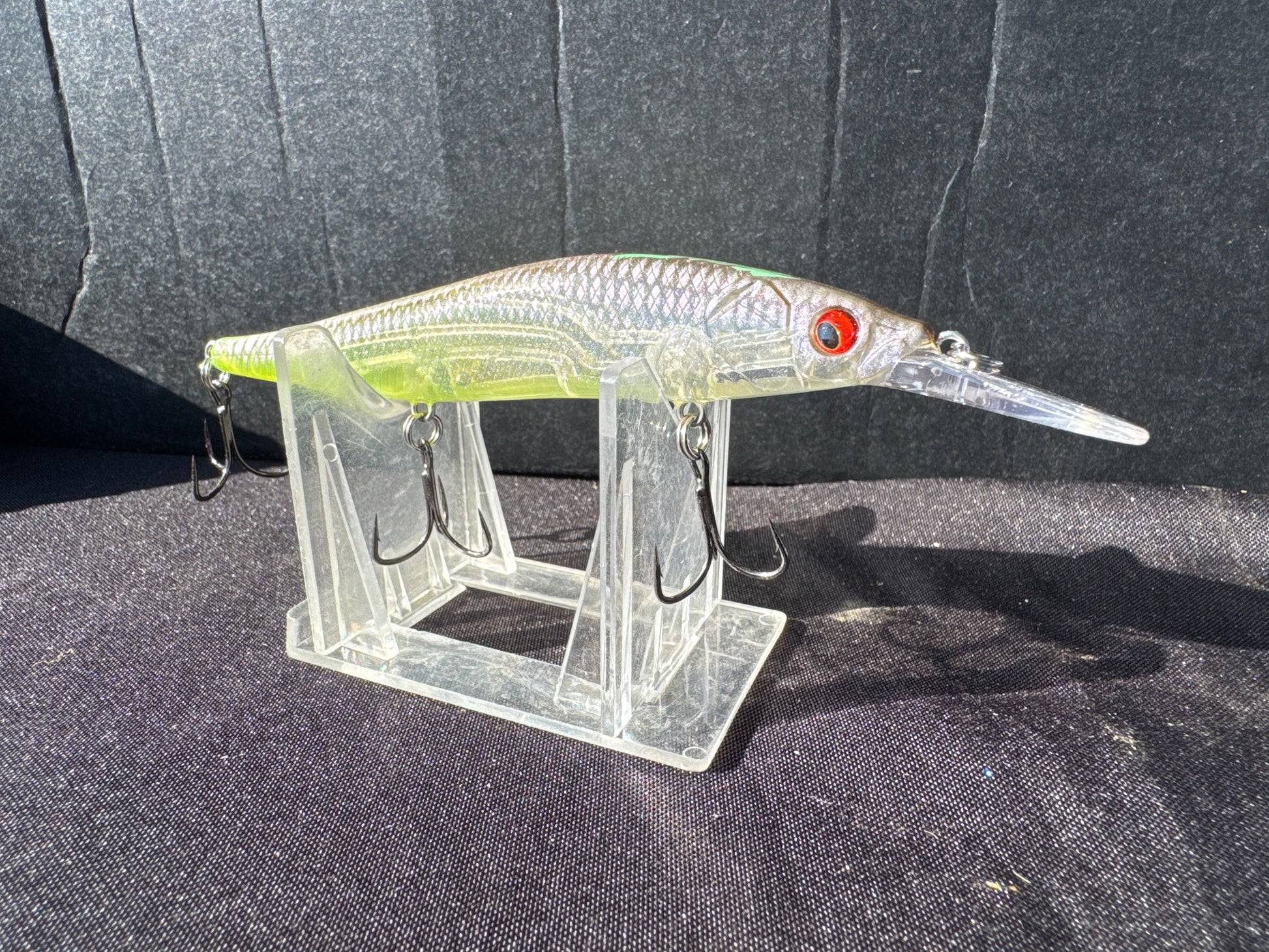 Diving dept: 7'-9' length: 5 1/2" weight: .6oz slow rising, steel ball rattle, kvd mustad hook or mix with a high carbon steel feather hook at the tail end. This one is a fish catcher.