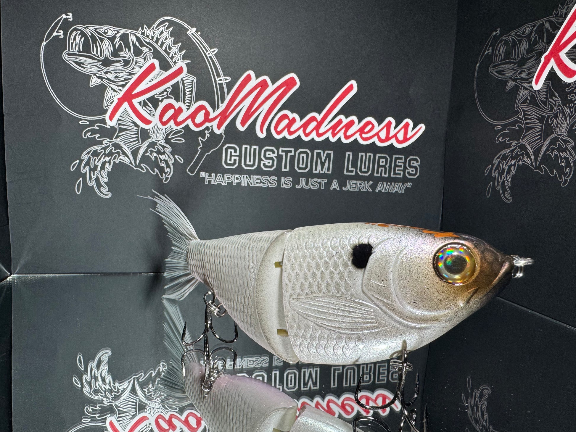 7 inch, 2.1 oz, slow sinking, 2 segments with rattling balls, swiveling front and rear hook hangers, colors shift depending on the light or angle, leaf flake with green , gold and silver, Mustad KVD hooks, Stainless steel split rings.