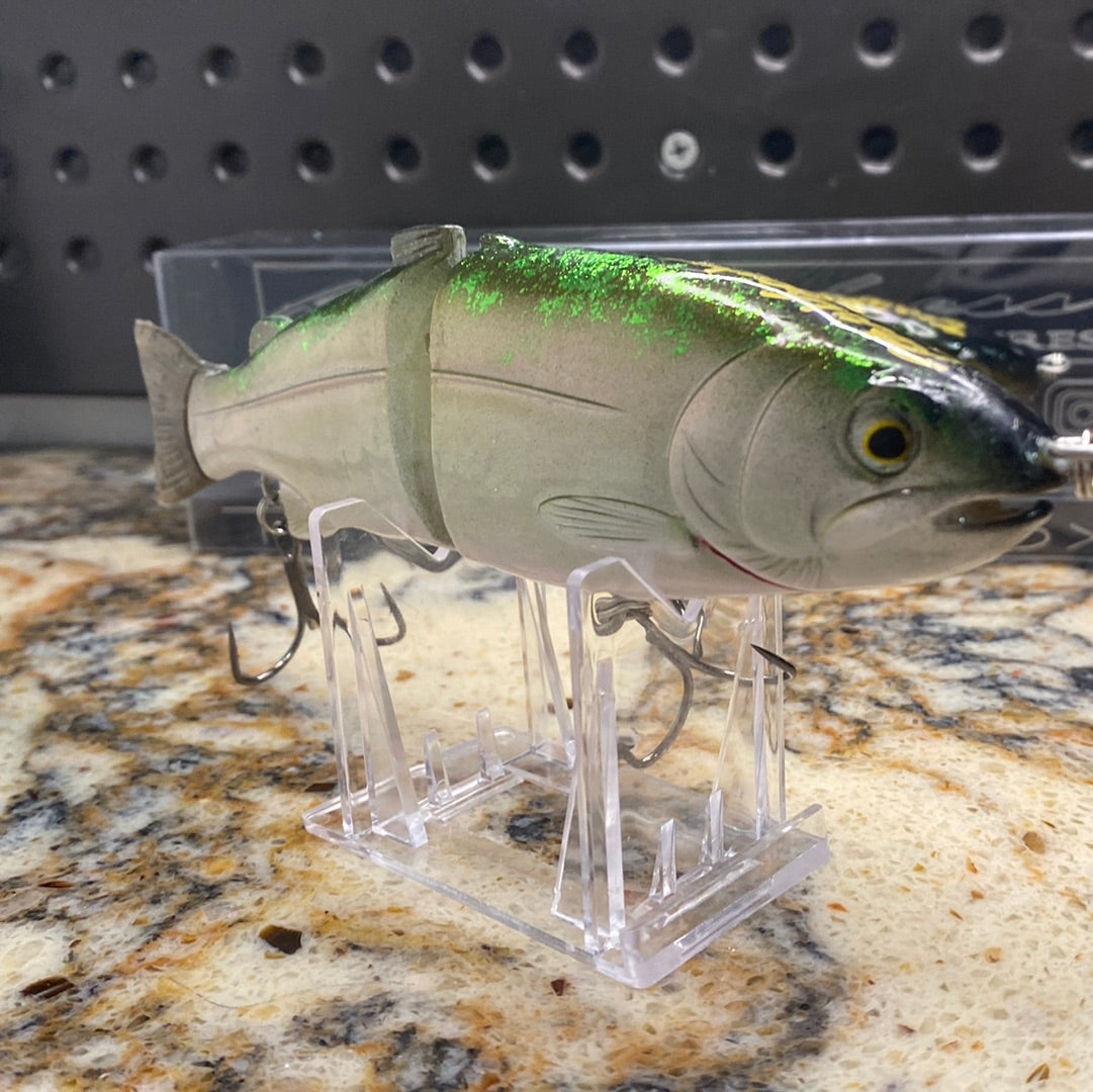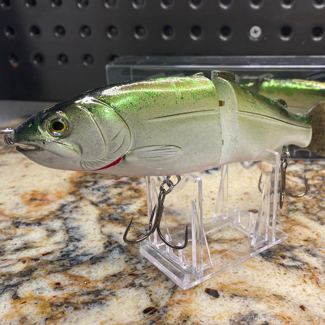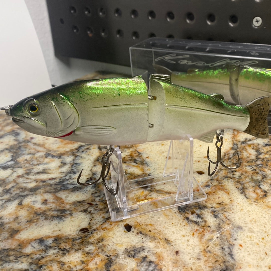 7 inch trout soft tail glide bait 2.2 oz. 2 segments with rattling balls, s- curve actio, color shift depending on the light or angle. Metal flakes on top given more shine. Mustad KVD hooks, Stainless steel split rings. Soft tail