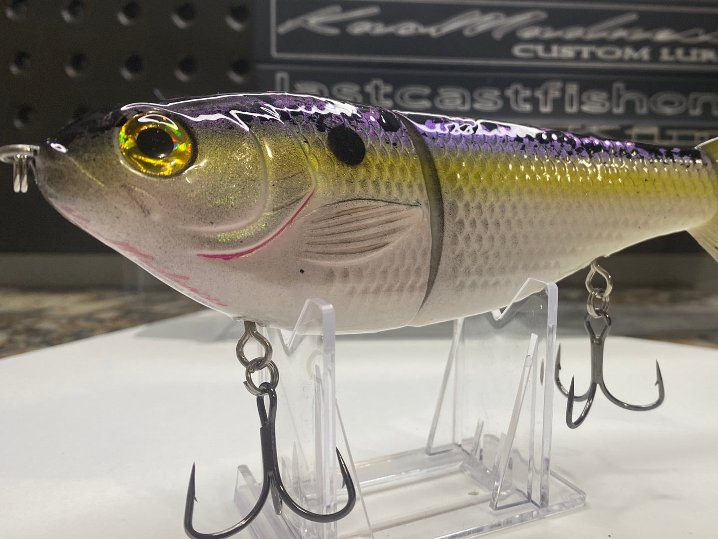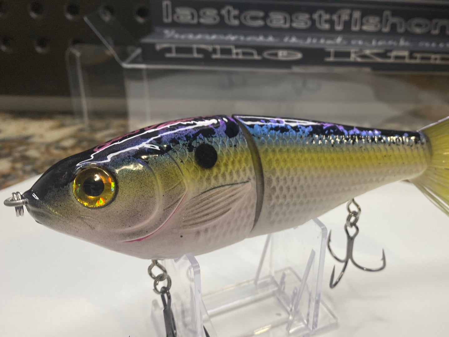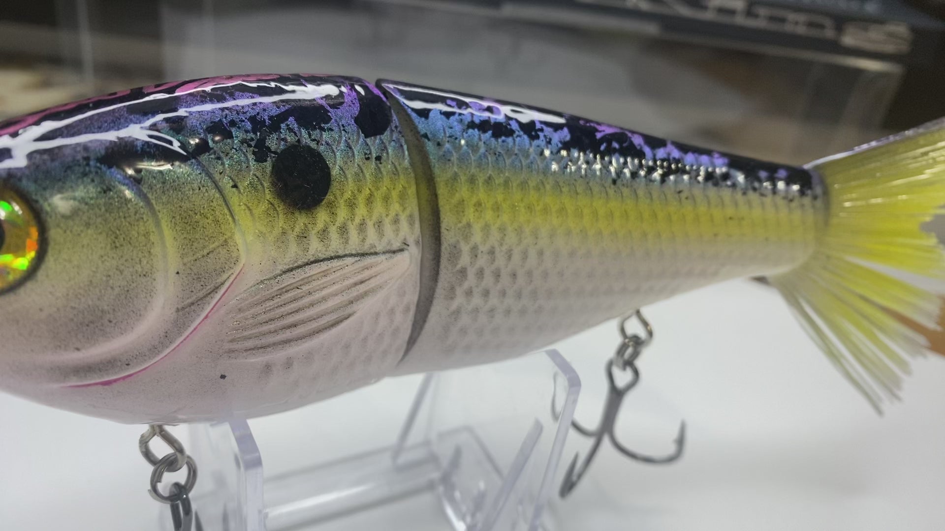 7 inch, 2.1 oz, slow sinking, 2 segments with rattling balls, swiveling front and rear hook hangers, colors shift depending on the light or angle, Mustad KVD hooks, Stainless steel split rings.