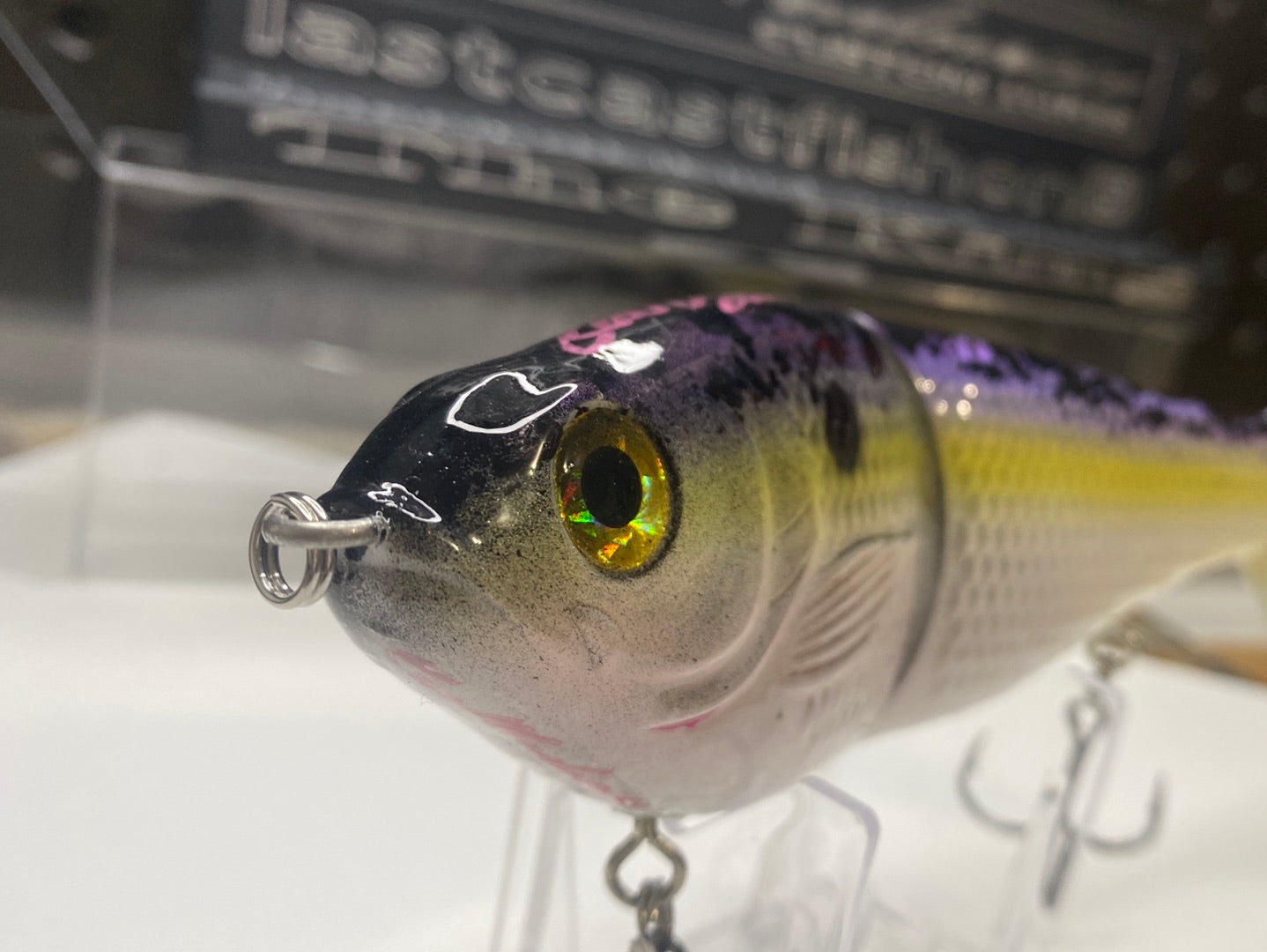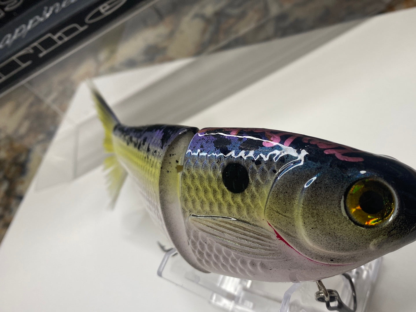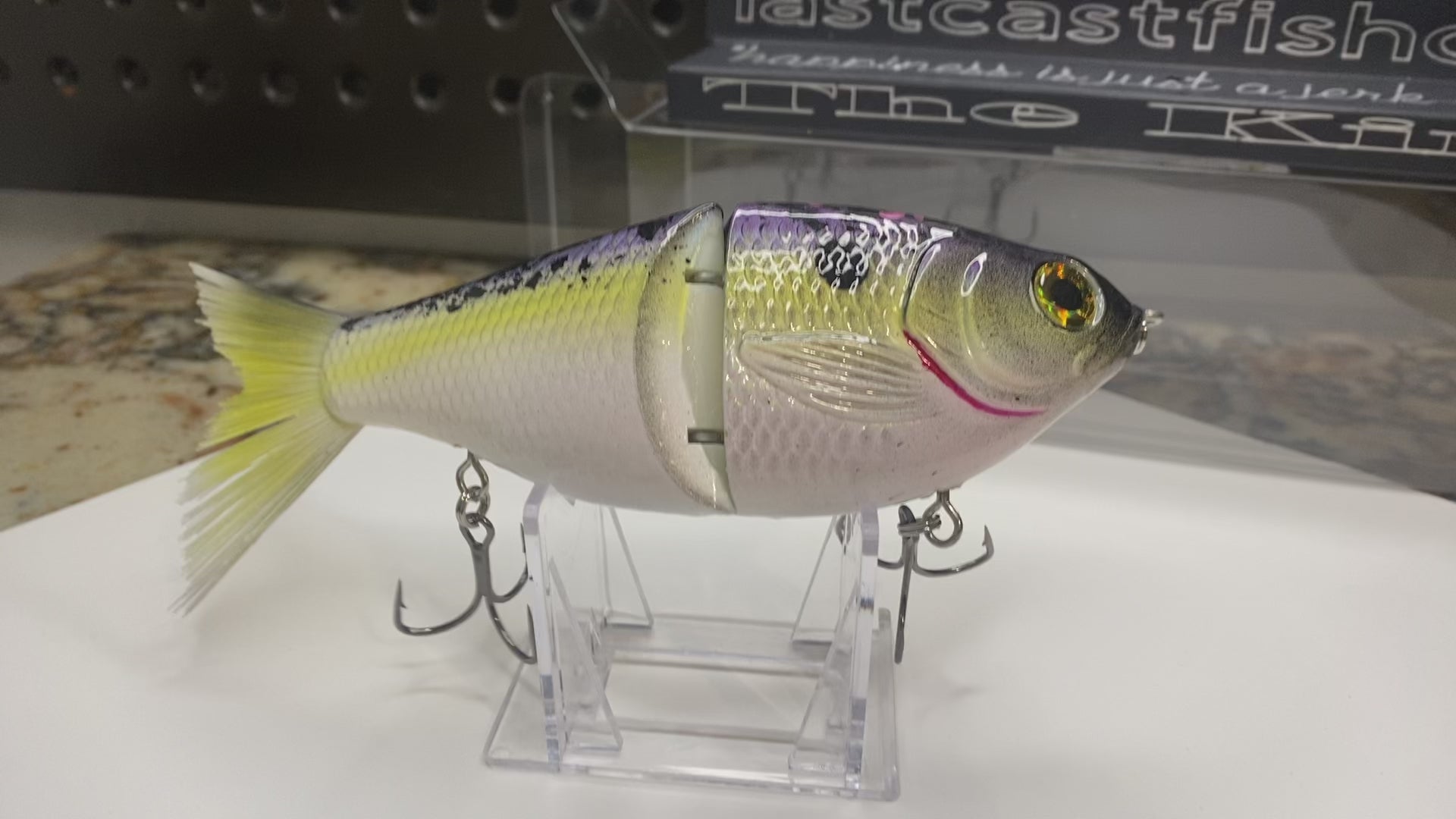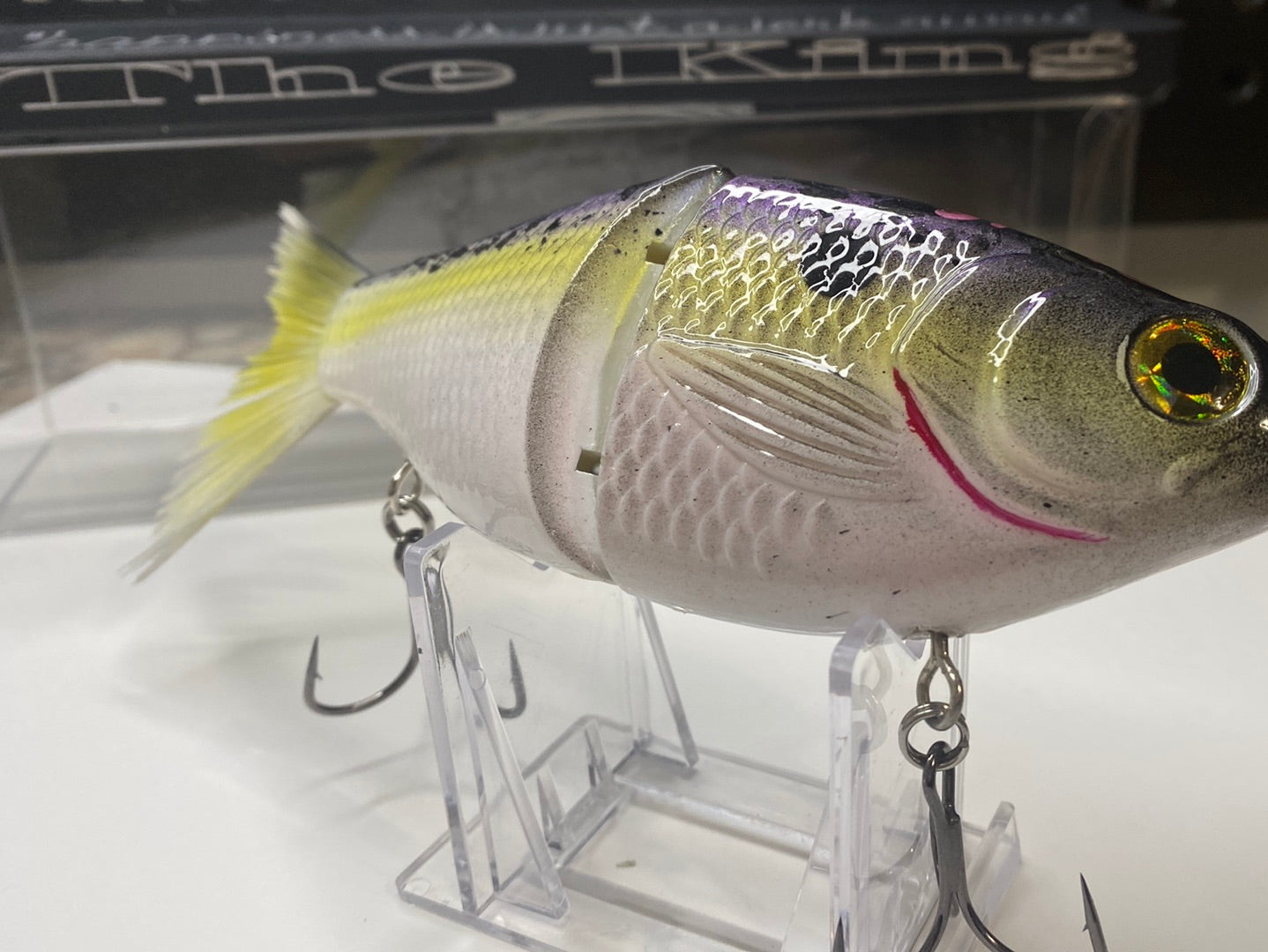 7 inch, 2.1 oz, slow sinking, 2 segments with rattling balls, swiveling front and rear hook hangers, colors shift depending on the light or angle, Mustad KVD hooks, Stainless steel split rings.
