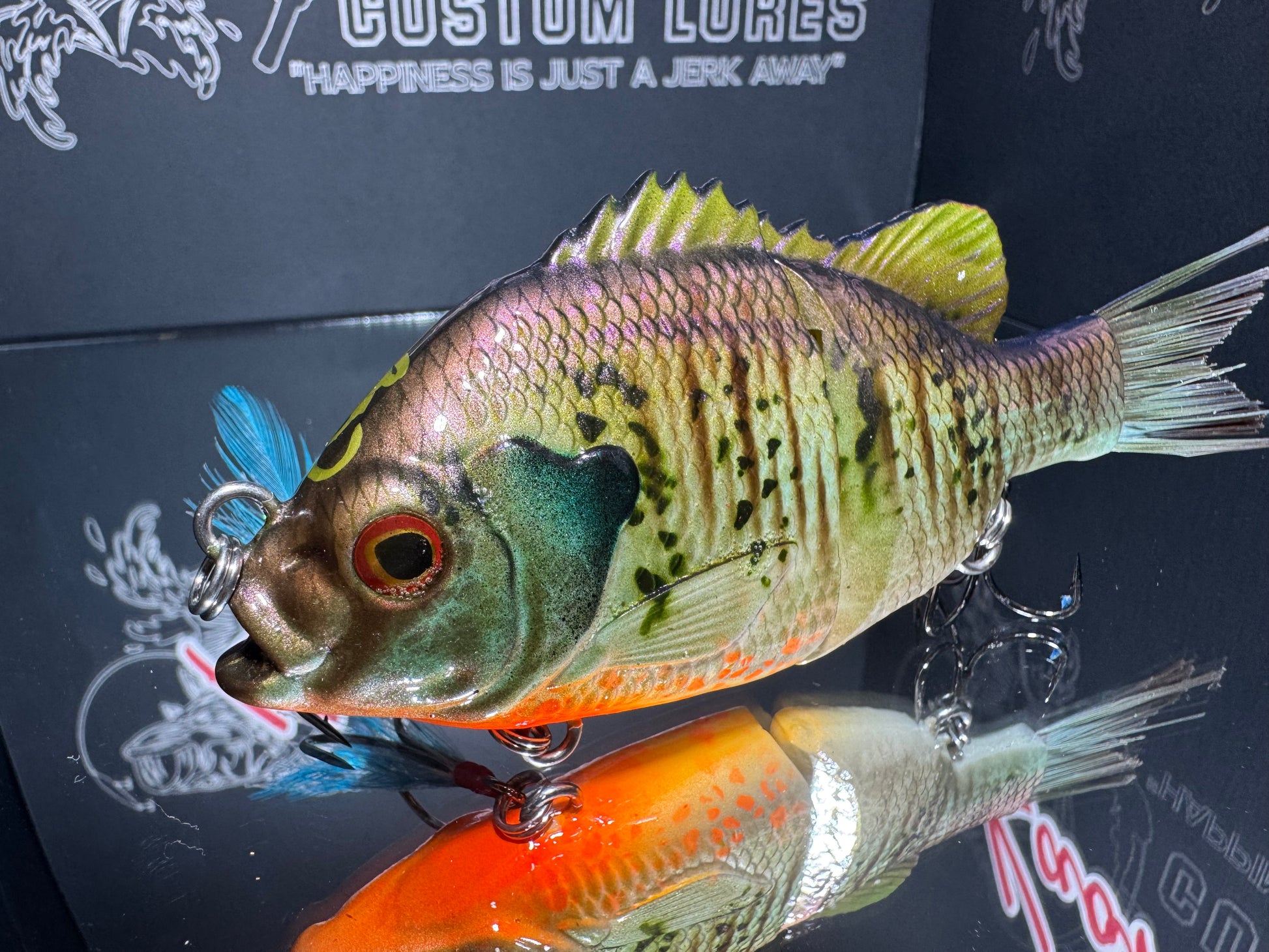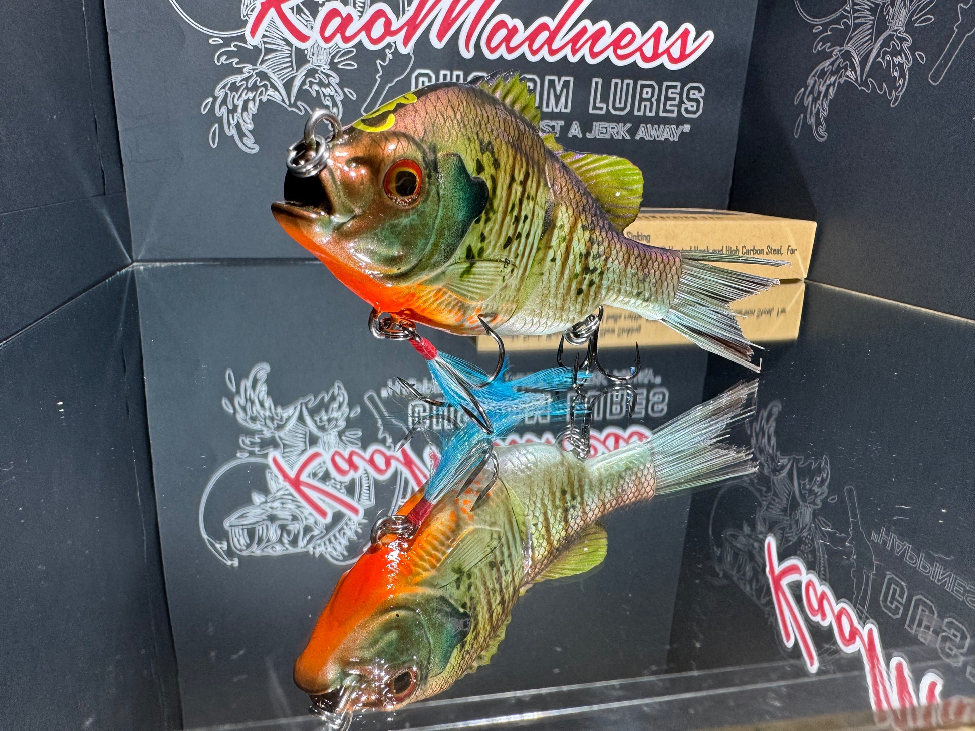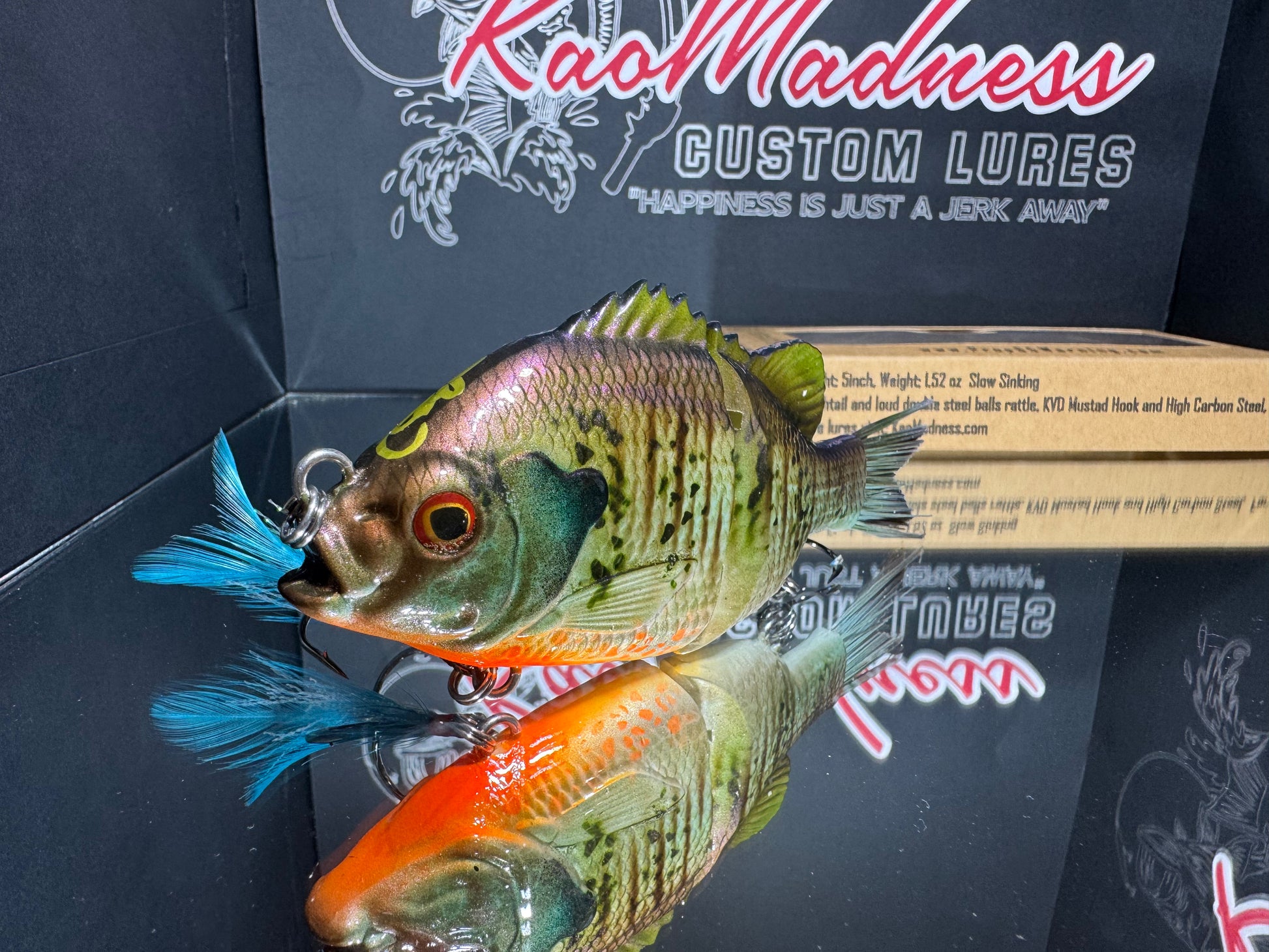 5-inch brushtail with rattling steel ball, 1.5 oz, Jointed S-Shape swimming pattern swim bait, swim downward action on retrieval about a foot, KVD Mustad Hooks. Red hook