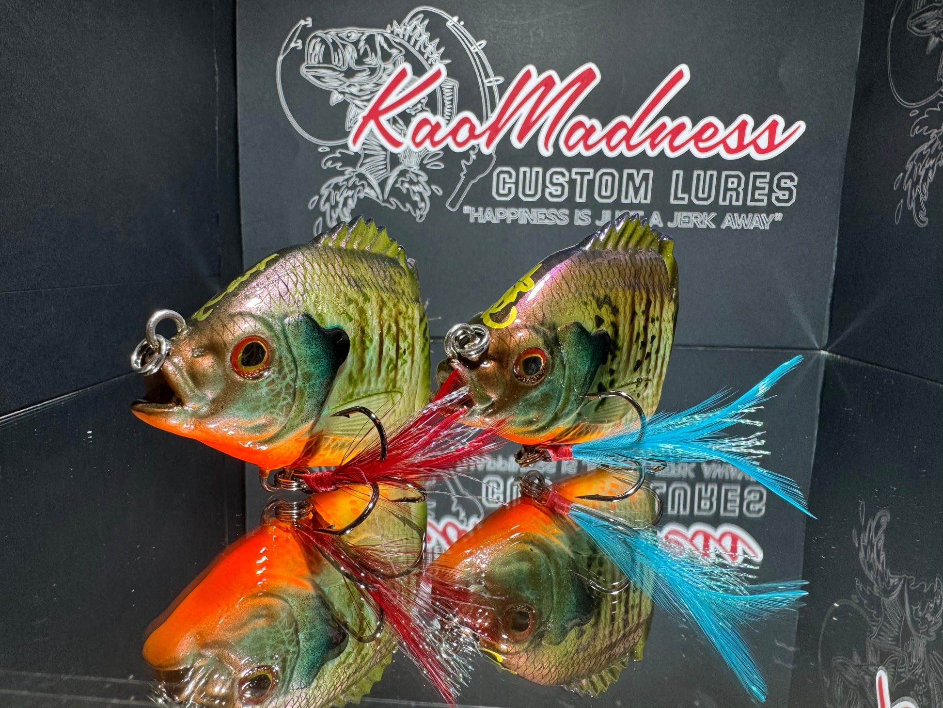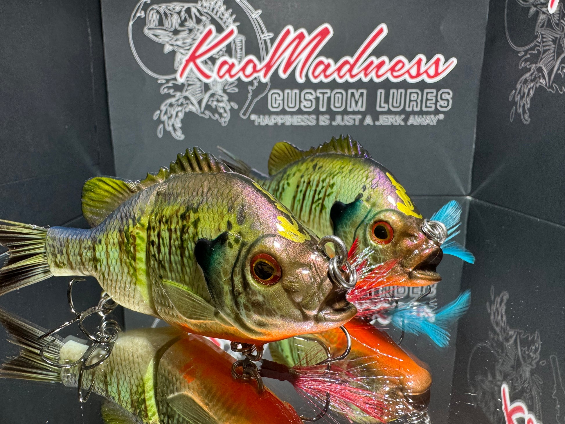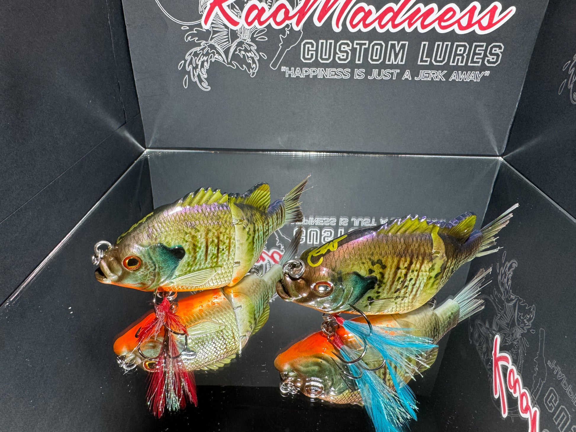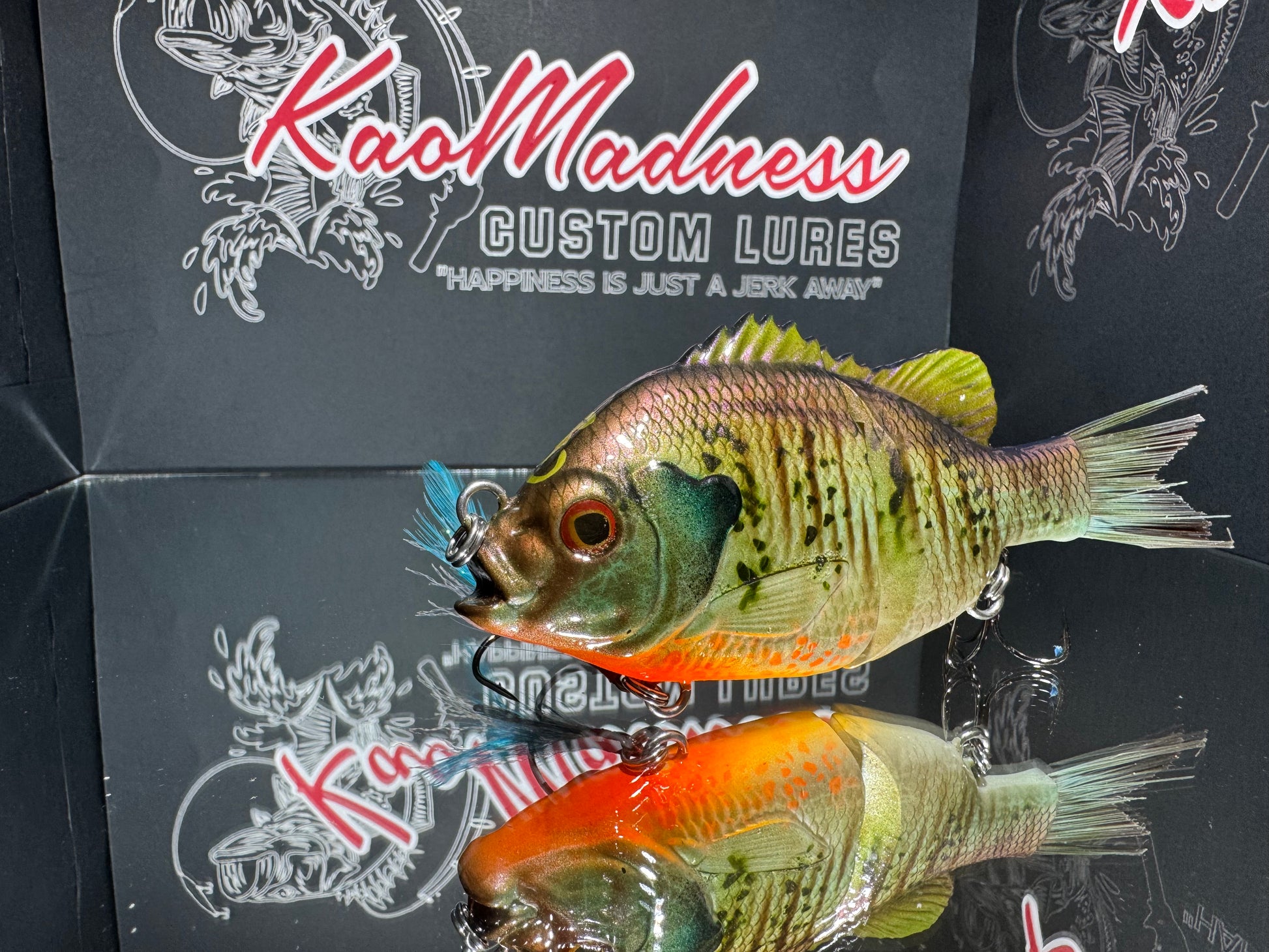 5-inch brushtail with rattling steel ball, 1.5 oz, Jointed S-Shape swimming pattern swim bait, swim downward action on retrieval about a foot, KVD Mustad Hooks. Red hook